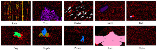 Event-based datasets serve as crucial instruments for propelling research in event-based visual sensor technologies. The availability of large-scale, public datasets, particularly those capturing high-speed motion and extreme lighting scenarios, can significantly expedite the progression of neuromorphic vision algorithms. The paucity of datasets dedicated to target segmentation stems from the challenges associated with acquiring pixel-level labels in event-based datasets. The DVS-OUTLAB dataset [22] comprises the static long monitoring data of urban outdoor scenes using a dynamic vision sensor, the Cele X-IV. The sensor provides a high-speed event output of 200 Meps (events per second), with a resolution of 768 × 640. The dataset consists of 47,878 regions of interest, each with a pixel resolution of 192 × 128, with labels provided for each event. The dataset is labeled according to 10 different categories: Rain, Tree, Shadow, Insect, Ball, Dog, Bicycle, Person, Bird, and Noise. A visual representation of the DVS-OUTLAB dataset, including its labels, is presented in Figure 3.