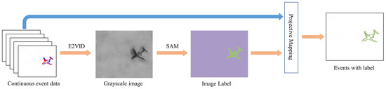 Given the impracticality of directly labeling event data, we transform the event data and propose using an automatic labeling method called Event to Labeled-Event (E2LabE). The core idea of the method is to replace event labels with grayscale image labels and map these labels to the corresponding events. The flowchart of E2Lab is depicted in Figure 4. Firstly, we employ the E2VID [23] reconstruction framework to derive grayscale images corresponding to the event data. Then, using the segmentation everything model (SAM) [24,25] parameters, we can acquire the segmentation results of the reconstructed grayscale images. Finally, to assign a label to each event, we perform a projective mapping operation that maps these 2D image labels onto the corresponding events in the event stream. The mapping relationship can be expressed as: