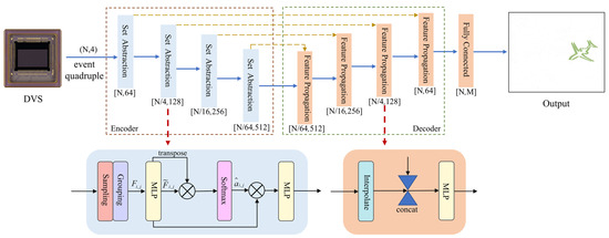 For the direct event stream segmentation task, we introduced EventSegNet, a network designed specifically for segmenting event data. EventSegNet takes event data as input and enables end-to-end event data object segmentation. The network consists of an encoder and decoder, with the encoder responsible for downsampling, primarily utilizing multiple SA layers. Notably, we incorporated an attention mechanism in the SA layers to facilitate local region feature extraction. The decoder facilitates point feature propagation through backward interpolation, restoring the original point count. Simultaneously, the local feature extraction layer, which contains an equal number of points, is interconnected with the upsampling layer’s feature information through skip connections. This fusion ensures that the resulting features incorporate both local and global aspects.