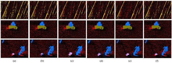 Sparse semantic segmentation results for several test event data from the DVS-OUTLAB dataset: (a) ground truth, (b) Unet 2D, (c) Unet 3D, (d) PointNet++, (e) EventSAM, and (f) our method.