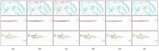 In our experiment, we collected 100 sets of event data from real scenes, each comprising an event stream of about 2 min. During the collection process, we considered various factors, including the scene illumination conditions and target scale sizes, to ensure the diversity of the dataset. The dataset is labeled according to five different categories: Airplane, Unmanned Aerial Vehicle (UAV), Cloud, Air Stream, and Noise. Figure 5 presents a visual representation of the DVS-AIROBJ dataset, including its labels. For the number of statistical event results presented in Table 1, the DVS-AIROBJ dataset contains approximately 3.43 × 109 events. The cloud category has the highest number of events, while the UAV category has the lowest number of events. The denoised data still exhibits some noise events, but it is noteworthy that the number of removed noise events is 15 times greater than for the current retained noise. This suggests that following noise filtering, the number of noise events is significantly reduced, thereby preventing the target event from being overwhelmed by noise, which is advantageous for subsequent research on target segmentation.