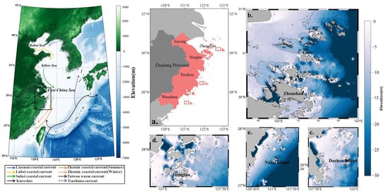 Topographic map of the study area. (a) Coastal map of Zhejiang Province. The red boxes in (a) are typical large yellow croaker cage aquaculture areas. (b–e) represent the locations of Zhoushan City in Zhejiang Province, Da Chen Island in Taizhou City, Dongtou District in Wenzhou City, and Nanji Island in Wenzhou City, respectively.