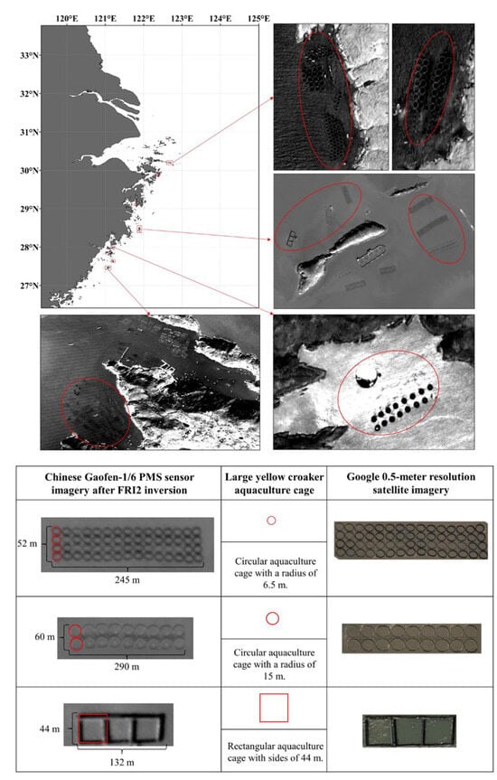 Furthermore, based on the spatial resolution of the satellite imagery, it can be deduced that there is variability in the size and shape of the cages within the large yellow croaker cage culture areas (Figure 4). The cages can be categorized by shape into circular (Figure 4) and rectangular designs (Figure 4). The circular cages can be roughly classified by radius into two sizes, approximately 6.5 m and 15 m in diameter (Figure 4). The rectangular cages can be approximated by the side length, with one size being around 44 m (Figure 4). This indicates diversity in the structural dimensions of the cage systems utilized in the aquaculture of large yellow croakers.