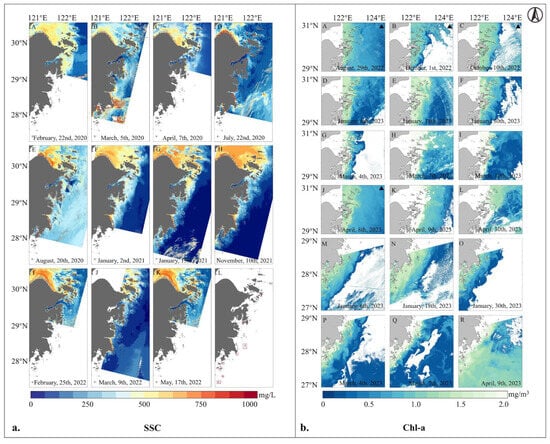 To achieve this, the SPM-CT suspended sediment concentration inversion formula (Equation (6)) was utilized in conjunction with remote sensing data from the Chinese GF satellite series, specifically GF-WFV imagery. The corresponding satellite image processing software was employed to generate a spatial distribution map of the suspended sediment concentration. The coastal waters of Zhejiang province were designated as the study area, with the observation period spanning from 2020 to 2022. In addition, the SS-1 Chl-a inversion formula (Equation (6)) was utilized in conjunction with remote sensing data from the Chinese HY-1C/D CZI sensor series. The corresponding satellite image processing software was employed to generate a spatial distribution map of the Chl-a concentration. The coastal waters of Zhejiang province were designated as the study area, with the observation period spanning from 2022 to 2023.