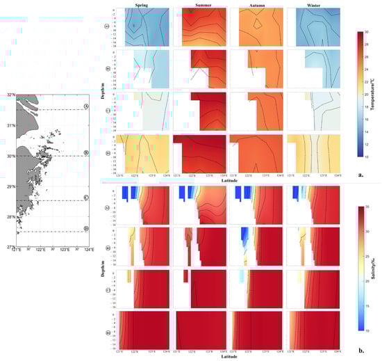 Sea temperature profile and salinity profile of typical large yellow croaker cage aquaculture area in coastal Zhejiang province. A–D are the four latitudinal profiles of the study area. (a) is the temperature profile, and (b) is the salinity profile.