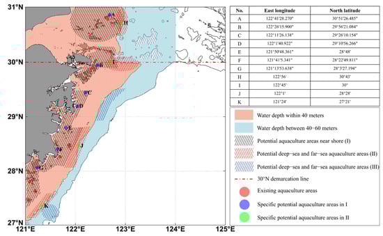 This study clarifies the potential range of aquaculture, further delineating the potential areas for deep-sea aquaculture. In the coastal area of Zhejiang Province, there are 11 potential breeding sites for large yellow croaker. Among them, seven sites have a water depth of less than 40 m, and four sites have a water depth ranging from 40 to 60 m. By innovatively applying the SSM-YLC evaluation method, we conducted a comprehensive assessment and scoring of these potential areas, identifying the central locations of the first-class aquaculture areas, with specific coordinates as follows: I: 122°45′ east longitude, 30° north latitude; A: 122°41′28.270″E longitude, 30°51′26.485″N latitude; G: 121°13′53.638″E longitude, 28°3′27.194″N latitude; H: 122°56′14.467″E longitude, 30°42′53.806”N latitude.