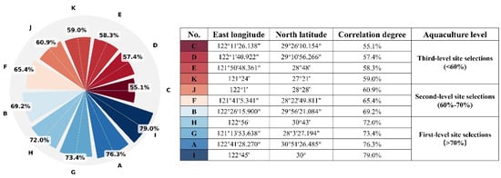 Societal factors like laws, development potential, and government support are pivotal for project legality, feasibility, and benefits. Assuming equal societal support for all sites, the focus shifts to geographical, environmental, and market factors [47]. This streamlined approach, reflecting Zhejiang’s commitment to aquaculture, aids in the efficient identification of optimal sites for sustainable industry growth [48].