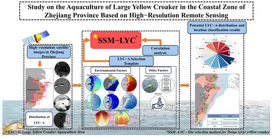 This research constructs an environmental factor template for the large yellow croaker aquaculture area, considering the intricate environmental factors present in such areas. The specific factors included in the template are Sea Surface Temperature (SST), Chlorophyll-a (Chl-a), Nutrients, Suspended Sediment Concentration (SSC), Current, Wind, Disaster Frequency, Average Depth of Aquaculture, Salinity, Upwelling, River plume, Market Proximity, and Marine Traffic. Subsequently, the study develops a method for the graded evaluation of potential aquaculture sites for large yellow croakers. Utilizing this methodology, a site selection plan and a grading system are implemented to identify and prioritize prospective aquaculture zones for large yellow croakers along the Zhejiang coast of China. From the perspective of marine remote sensing, this study intends to summarize the known environmental characteristics of the propagation and aquaculture areas of large yellow croakers through high-resolution marine satellite data, find the potential cage aquaculture areas of large yellow croakers, and construct an evaluation system of large yellow croaker aquaculture areas.
