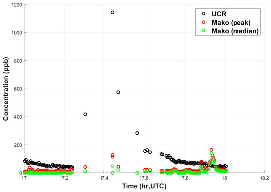 | Overpass Time (UTC) | In Situ NH3 (ppbv) | Mako Ammonia Retrieval (ppbv) | ΔT (°C) | H (m) | MDC (ppbv) | ||