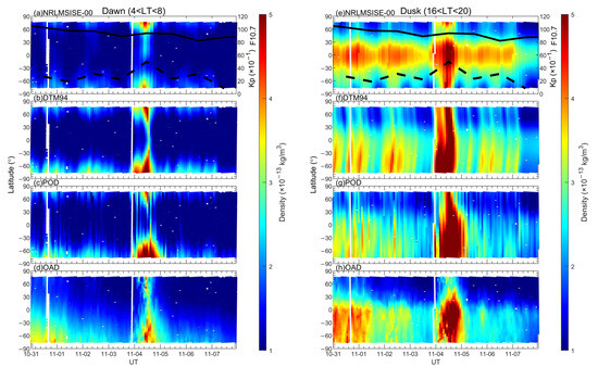 Observations of POD and OAD derived from the QQ-Satellite and simulations derived from empirical atmospheric models of NRLMSISE-00 and DTM94 are investigated to explore variations in thermospheric mass density under different conditions of solar radiation and geomagnetic activity. Benefitting from dawn–dusk orbits of the QQ-Satellite, variations in density at the dawn side (4–8 LT) and at the dusk side (16–20 LT) can be demonstrated here. As shown in Figure 2, during quiet periods, enhancements of all densities are closely relevant to solar radiation, represented by the F10.7 index here, illustrating a crucial source of the heating of the thermosphere. For storm periods, prominent and violent disturbances of densities appear when the Kp index gradually reaches a peak. Furthermore, densities of the southern/summer hemisphere are larger than that of the northern/winter hemisphere, exhibiting hemispheric asymmetry. And densities of the dusk side are larger than that of the dawn side, which indicates that density variations are also dependent on LT.