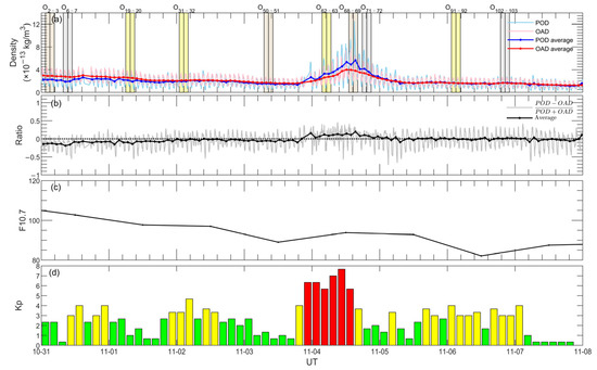 During the process of determining POD-derived densities, atmospheric density models are used to estimate accelerations, a significant portion of which are used to obtain drag accelerations to derive densities, to compensate for errors of dynamics models and orbit predictions based on GPS data [42,43,44]. Therefore, both measurement errors and model uncertainties can contribute to deviations in densities derived from drag accelerations [45]. In this paper, the empirical model DTM94, utilized to obtain empirical densities as the initial inputs, therefore could impact POD densities. And in our study results, POD resembles DTM94 in variations under some circumstances. Given that, differences illustrated in Figure 5a,b,e,f might arise from the impacts of DTM94 on POD densities, namely underestimation for high F10.7 and overestimation for high Kp. For increasing periods, except for the differences mentioned above, POD is in agreement with OAD generally under other conditions, as demonstrated in Figure 5c,d.