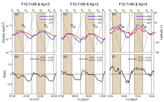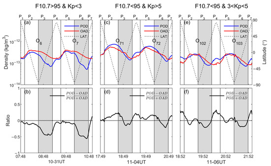 During increasing periods, differences in POD and OAD on typical orbits, corresponding to different space-weather conditions, are mainly characterized by three patterns, as shown in Figure 5. The increasing/decreasing/transition periods are distinguished as intervals P1,4,7/P2,5/P3,6, and the increasing periods are highlighted in brown, discussed only here. In Figure 5a,b, for high solar activity and low geomagnetic activity, POD densities are smaller than OAD densities, as mentioned in Section 3.1. OAD obviously elevates overall for increasing F10.7, which is almost not seen in POD. On the contrary, POD densities are larger than OAD densities for severe geomagnetic storms, also accompanied by more prominent fluctuation features in OAD, as shown in Figure 5e,f.