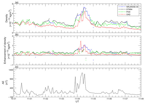 Based on the above analysis, density peaks of bulge structures from simulations and observations are determined and examined. Variations in the peaks of bulges and their relative enhancements for all orbits, along with variations in the auroral electrojet (AE) index, are demonstrated in Figure 8. The lacking dots in Figure 8 represent the absence of bulge structures on corresponding orbits. The peaks of bulges minus the averages of density on the corresponding orbit are enhancements of density, as shown in Figure 8b. By contrast, bulges of density from the models are fewer, especially for NRLMSISE-00, yet OAD appears bulge for almost all orbits. For all 120 orbits investigated, the numbers of orbits appearing with bulge features for NRLMSISE-00, DTM94, POD, and OAD are 40, 104, 110, and 119, respectively. Moreover, notably, the magnitudes of POD peaks are almost always larger than those of OAD peaks, as mentioned above, which could be related to neutral winds. Bruinsma et al. [45,48] suggested that the speed of neutral winds could reach on the order of 500–1000 m/s during geomagnetic storm periods as well as at high latitudes, which is non-ignorable for estimations of atmospheric density. Due to the neglect of neutral winds in data processing, the speed of the satellite is actually exaggerated, finally leading to overestimations of POD densities () but underestimations of OAD densities (). Further, enhancements of peaks from all densities, especially for OAD densities, exhibit relatively great agreements with the AE index, indicating strong associations with energy injection and particle precipitation in polar regions during geomagnetic storms.