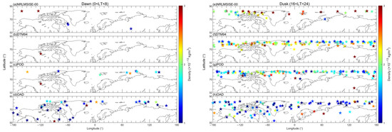 As shown in Figure 11, latitudinal enhancements of OAD, represented by ratios of densities during storm periods relative to quiet periods, are investigated. The black solid lines and dashed lines represent quiet and recovery periods, respectively. The rainbow-colored lines represent the main phases of a geomagnetic storm, and the time sequences are shown at the top of Figure 11. During quiet periods, whether for dawn or dusk, densities hardly enhance, except for polar regions. However, for the main phase of the storm, distinct dawn–dusk differences emerge. At dawn, densities enhance firstly in the two poles, more prominently in the north pole, then propagate into middle and low latitudes, and finally concentrate on equatorial regions. At dusk, similarly, densities enhance firstly in the polar regions, yet there are no obvious hemispheric differences. Furthermore, at dusk, disturbed density mainly focuses on the middle and low latitudes, appearing as densely wave-like features. For recovery periods, densities decrease gradually to initial levels whether at dawn or dusk, but are more disturbed at dusk.