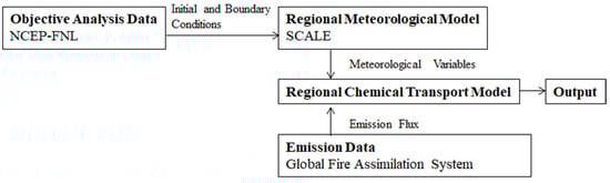 The amount of air pollutants generated by biomass combustion is estimated from the amount of combustion per unit area, combustion area, combustion efficiency, and emission factors. Since fires are hot at the source, information on the detection of high-temperature anomalies from satellite observations can be used to obtain this information. We used the Global Fire Assimilation System [18] for biomass burning emissions. The Global Fire Assimilation System assimilates NASA’s Terra MODIS and Aqua MODIS fire products and provides emissions from daily biomass burning.