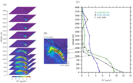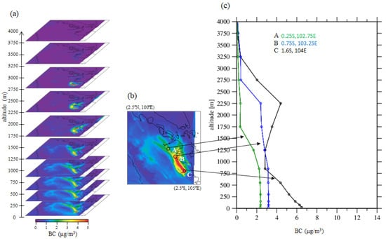 BC concentration distribution by regional chemical transport model at 3:30 UT on 21 September 2019 for S1. (a) shows distribution by altitude, (b) shows distribution of vertical accumulation, and (c) shows vertical distribution of points circled in black in (b).