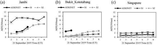 AERONET and simulated AOT at 550 nm averaged from 3:00 to 4:00 UT on 21 September 2019 at (a) Jambi (1.632°S, 103.642°E), (b) Bukit_Kototabang (0.202°S, 100.318°E), and (c) Singapore (1.298°N, 103.78°E).