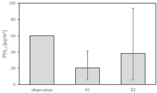 To further validate the simulation results, we compared the observed PM2.5 concentrations near the ground at Jambi with the S1 and S2 simulation results. Because observation data for 21 September 2019 were not available, comparative verification was performed for the daily average PM2.5 concentration on 19 September 2019, when available observation data were available. As Figure 7 shows, both S1 and S2 are underestimated relative to the observed values, but S2 shows concentrations closer to the observed values. Interestingly, S1 values were larger than S2 values in the AOT simulation results, whereas S1 values for PM2.5 concentrations were smaller than S2 values.