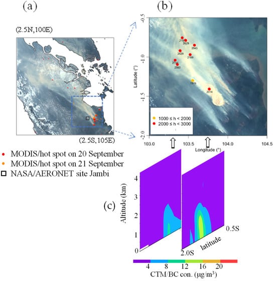 Satellite observation data were used to validate the distribution of fire origin aerosols reproduced by the chemical transport model. Figure 8a is a color composite image of SGLI, with the three primary colors (R, G, and B) corresponding to the normal wavelength bands (674, 530, and 443 nm), and the dots on the image represent MODIS hotspots. From this, it can be seen that there is thick smoke drifting in the air that appears to originate from wildfires. The simulation with the injection altitude set to 1 km is used because of its good reproducibility based on AERONET data. Here, we show the top height of the biomass burning plume estimated from two directional data of SGLI. Figure 8b shows the height of the plume for the same wildfire area in Figure 4. The detailed algorithms were interpreted in a previous study [40]. Only the results are presented here. The height of the plume is classified by color. For example, red indicates the plumes that are higher than 2 km. Figure 8c presents the vertical profile of BC concentration (μg/m3), which is simulated from the regional chemical transport model along the latitude from 0.5°S to 2.0°S at two longitudes indicated by the arrows. The BC is distributed over an altitude of 2 km. There is no discrepancy between the simulated BC and the BBA plume top height calculated from the SGLI data. From this, it is possible to say that the numerical model has been partly validated by the BBA plume heights estimated from the SGLI data.
