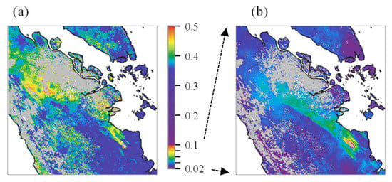 (a) Reflectance and (b) polarized reflectance at 869 nm derived from GCOM-C/SGLI at 3:30 UT on 21 September 2019 over same scene as Figure 5. Clouds defined with JAXA/SGLI/L2/ver-2 are represented by gray.
