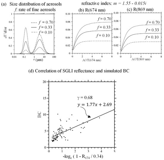 Examples of reflectance versus aerosol optical thickness (AOT) for carbonaceous aerosol model. (a) Bi-modal log-normal size distribution with fine particle fraction f, (b) reflectance (R) versus aerosol optical thickness (AOT) at wavelength λ = 674 nm, (c) same as (b) but for λ = 869 nm, (d) correlation of SGLI reflectance and simulated BC in 50 km resolution at 3:30 UT on 21 September 2019.