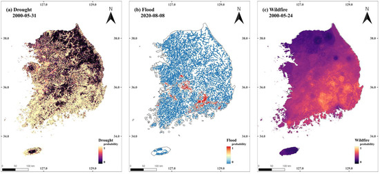 - Piao, Y.; Lee, D.; Park, S.; Kim, H.G.; Jin, Y.H. Multi-hazard mapping of droughts and forest fires using a multi-layer hazards approach with machine learning algorithms. Geomat. Nat. Hazards Risk 2022, 13, 2649–2673. [Google Scholar] [CrossRef]