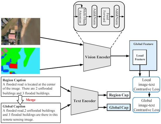 To mitigate the cost of image annotation, region-level image–text pairs are constructed based on annotated data by contrastive learning for segmenting object mask features, based on existing annotated datasets such as remote sensing image object detection and semantic segmentation, and design specifications to generate corresponding image descriptions. The global description of an image consists of three parts: Global Description 1—Describe the terrain information in the area where the center of the image coincides with the center of the original image, and the length/width is half of the original image. Global Description 2—Describe the terrain information except for the central area defined in 1. Global Description 3—Describe the information of the entire image features. At the same time, add information such as the type, location, and mask of independent objects as local area descriptions in the description.
