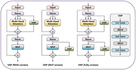 As shown in the Figure 3, the VAP module consists of three convolutional layers: a 1 × 1 convolutional layer for channel dimension reduction, a 3 × 3 convolutional layer with an equal number of input and output channels, and another 1 × 1 convolutional layer for channel dimension expansion. In between these convolutional layers, GELU is utilized as the activation function. Given that ViT flattens image data into a one-dimensional token sequence, it is necessary to restore the token sequence back into a two-dimensional structure before applying the convolutions. The token is included here to mark individual images.