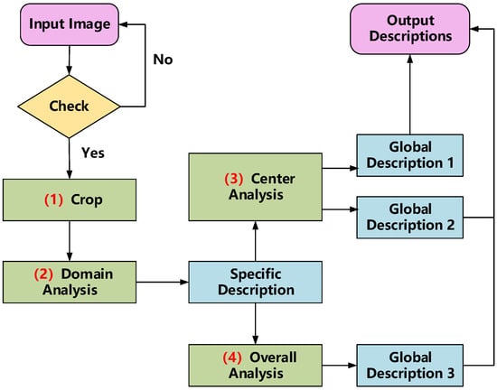Flowchart of the description generation stage. The main steps are as follows: (1) adaptive image cropping for manageable processing, (2) connected-domain analysis for object attribute extraction, (3) center-based spatial description generation, and (4) global statistical analysis for comprehensive scene characterization.