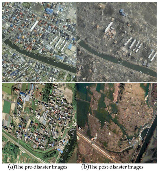 In this study, we utilize the xBD satellite image dataset [9], consisting of 22,068 high-resolution images (1024 × 1024 × 3) that cover a comprehensive range of pre- and post-disaster scenarios. Several samples are displayed in Figure 2, with the top row showing pre-disaster images and the bottom row presenting the corresponding post-disaster images. These three pairs of images are sampled from three different types of disasters, i.e., tornado, flooding, and tsunami. In (a), most buildings are destroyed by the hurricane except the buildings at the bottom right corner. In (b), the building suffered major damage because it is completely surrounded by water. In (c), the two commercial buildings within the red rectangle are destroyed by the tsunami. Even though the xBD dataset has lots of merits mentioned above, there are two main issues with this dataset, which are an imbalanced class issue and a misalignment issue between pre- and post-disaster images.