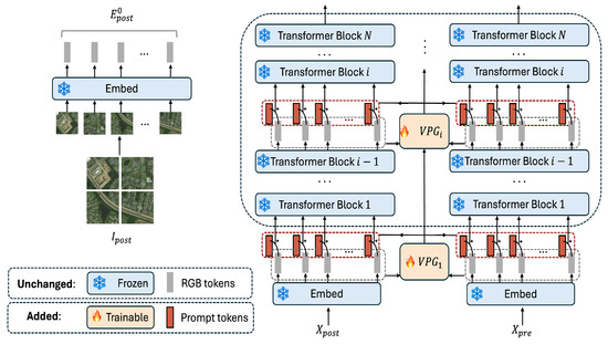 As shown in Equation (6), visual prompt is generated by module based on the prompt and embedding sequences and generated in the previous stage. The VPG module is designed to learn and apply visual prompts that effectively capture the difference between the pre- and post-disaster states. The process proceeds as follows: