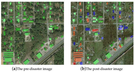 The ground truth of pre- and post-disaster images. In (a), each polygon represents a location for a building. In (b), the green, blue, orange, and red colors represent the four different damage levels: “no damage”, “minor damage”, “major damage”, and “destroyed”, respectively.