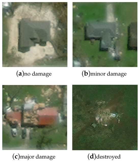 In the xBD dataset, there are five classes, including “no damage”, “minor damage”, “major damage”, “destroyed”, and “unclassified”. A building labeled with “no damage” class means that there is no sign of water, structural or shingle damage, or burn marks. Buildings with “minor damage” means that these buildings are partially burnt or in water surrounding structures, etc. A building annotated as “major damage” means that there exists partial wall or roof collapse, or the building is surrounded by water or mud, etc. The “destroyed” class is for the building that is completely collapsed, covered by water or mud, etc. The “unclassified” class is the data without ground truth, which are removed from our study. Several samples are shown in Figure 6.
