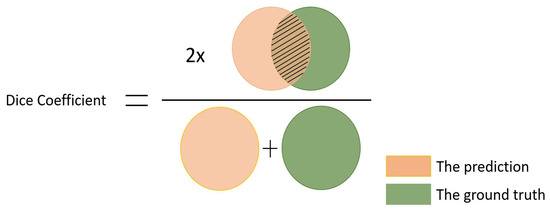 Dice Loss is one of the losses that can be used to directly optimize the segmentation metric (F1 score). It aims to minimize the mismatched regions and maximize the overlap regions between the ground truth and predicted segmentation [24]. It evolves from the Dice coefficient which is shown in Figure 7. In this figure, the shaded area is the overlap of the ground truth and the prediction. The numerator consists of twice the overlap, and the denominator is the sum of the ground truth and the prediction. Dice Loss can be defined as Equation (16), where is a small positive infinitesimal quantity.