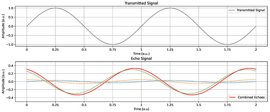 Transmitted and received signal for a single frequency. The received signal is a sum of all the echoes.
