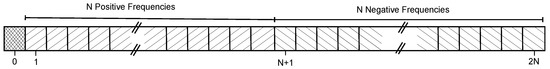 A symmetric frequency spectrum is typical for real-valued signals, where only the positive frequencies are explicitly stored, as the negative frequencies are their complex conjugates. By applying the IFFT to this structured frequency data, a time-domain representation of the signal is obtained, which can be used for further analysis or processing. Figure 3 shows the data structure of the complex frequency-domain input before transformation into the time domain. The array structure consists of a zero DC component, followed by raw frequency-domain samples, and then conjugated raw data arranged in reversed order. As a result, the extended data array and the corresponding time-domain array have a length of 2N + 1. A key characteristic of the unshifted IDFT is that the raw frequency-domain data samples are not aligned in a way that directly synchronizes with the appropriate frequency bins of the IFFT. This misalignment affects the spectral coherence of the reconstructed signal.