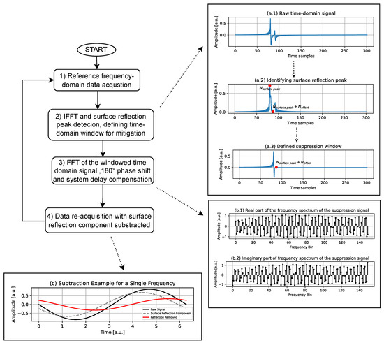 The flowchart consists of four steps. The first step involves collecting the signal in the frequency domain. These raw data are then processed in the second step. Here, IFFT converts the frequency-domain data into the time domain, allowing for the detection of the surface reflection peak. A time-domain suppression window is then defined to suppress the surface reflection. In the third step, the previously windowed signal is transformed back into the frequency domain using FFT. A phase shift of 180° is applied to cancel out the surface reflection, while system delay compensation ensures proper alignment of the signals. Finally, in the fourth step, the processed data are reacquired with the surface reflection component removed.