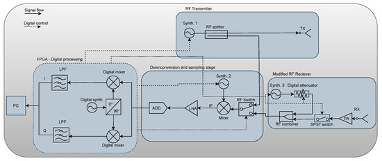 To test the surface reflection suppression method, we designed a modular SFCW radar based on a standard superheterodyne architecture. The block diagram of the system is shown in Figure 5, divided into four main sections: IQ demodulator, RF to IF band conversion stage, transmitter, and a slightly modified RF receiver, where an additional signal synthesizer and digital attenuator are added, which synthesize a suppression signal that is then combined with the received signal via an RF combiner. The entire system is controlled using an AMD Artix-7 35T Arty FPGA board. Conversion to complex IQ signals is implemented digitally. Additionally, a serial link is established between the FPGA and PC board for the continuous data stream, enabling further signal processing.