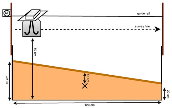 Schematic representation of the experimental setup, depicting the survey line, guide rail, and measurement setup.