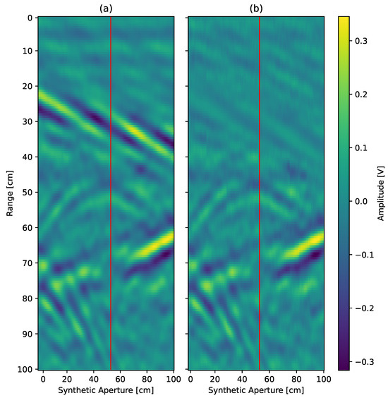 (a) B-scan of the scene. (b) B-scan after applying the surface suppression algorithm. The red line indicates the selected trace used for further analysis. The horizontal axis represents the linear movement of the radar along the scan line, while the vertical axis indicates the depth relative to the radar, computed from signal delay using the propagation speed in air.
