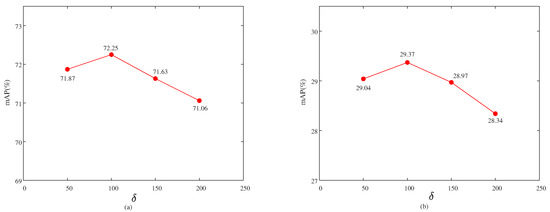 (3) Parameter Analysis of δ: As illustrated in Figure 4, the is quantitatively analyzed in terms of mAP across the DIOR and NWPU VHR-10.v2 datasets. We evaluate over the range {50, 100, 150, 200} to assess its impact. The results show that both datasets achieve the highest mAP when = 100. Therefore, we set = 100 as the default value in our model.