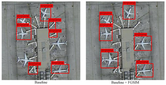 As shown in Figure 5, the Baseline fails to detect all airplanes with arbitrary orientations; however, our model can correctly identify them, which is attributed to the incorporation of the FGSIM module. The FGSIM module leverages feature similarity measurements to discover additional seed instances with lower class scores, thereby encouraging the model to detect as many foreground objects as possible.