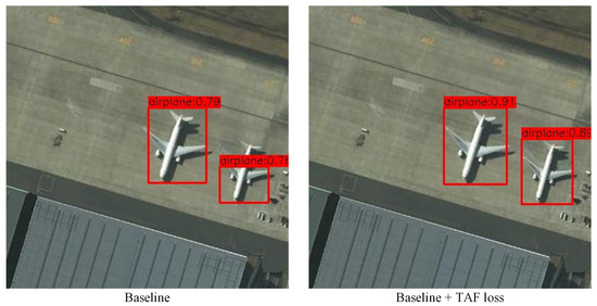 As shown in Figure 6, the airplane on the right side of the image receives a high classification score but suffers from poor localization in the baseline model, indicating an inconsistency between classification confidence and localization accuracy. After applying the TAF loss, our model not only assigns a more accurate bounding box to the same airplane, but also provides a higher and more consistent classification score. This demonstrates that TAF loss effectively improves the consistency between classification and localization.
