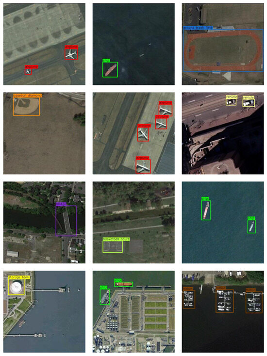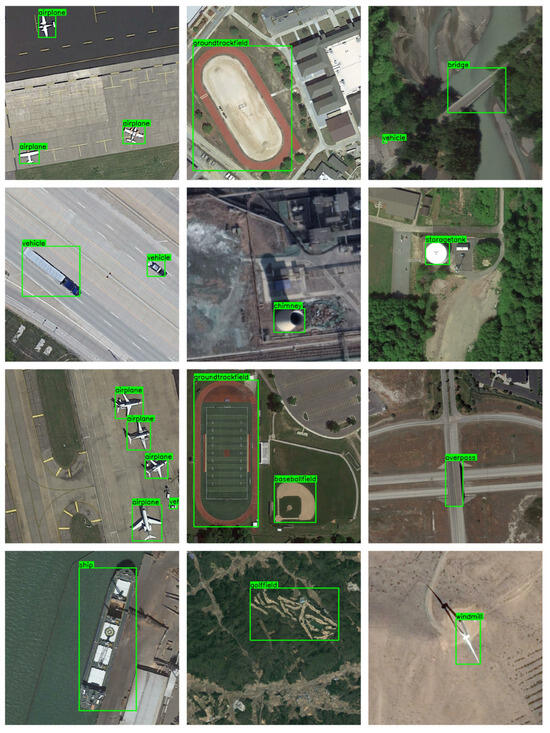 The experiments are conducted on the NWPU VHR-10.v2 [43,44] and DIOR [45] datasets. The NWPU VHR-10.v2 dataset contains 1,172 RSIs, each with a resolution of 400 × 400 pixels, and a total of 2775 object instances across 10 categories. It is split into three subsets: a training set (679 images), a validation set (200 images), and a testing set (293 images), where the training and validation subsets are used for model training and the testing subset for evaluation. The DIOR dataset, consisting of 23,463 RSIs with a resolution of 800 × 800 pixels, contains 192,472 labeled instances across 20 categories. It is split into a training set (5862 images), a validation set (5863 images), and a testing set (11,738 images), where the training and validation subsets are used for training and the testing set for evaluation.