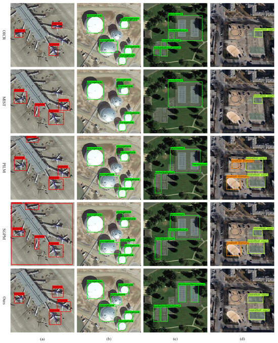 Figure 7 and Figure 8 illustrate our model’s detection results on the NWPU VHR-10.v2 and DIOR datasets, respectively. We visualize results from 24 test images to demonstrate the model’s effectiveness. Furthermore, to qualitatively compare our model with four representative WSOD approaches (i.e., OICR, MIST, PILM, and SGPM), we present detailed visual analyses in Figure 9. Specifically, as shown in Figure 9a, existing methods fail to detect all airplanes, especially those with arbitrary orientations. In contrast, our model accurately identifies all airplane instances. This improvement is due to two key components: First, the FGSIM strategy leverages feature similarity between instances to mine additional seed instances with lower class scores, thus providing richer supervisory signals. Second, the original RSI and its rotated counterpart are processed by separate ICR branches, allowing for consistent predictions via iterative supervision between ICR branches. In Figure 9b, methods such as MIST, PILM, and SGPM misclassify the shadows of storage tanks as foreground objects. Our model avoids this misclassification thanks to a contrastive loss that enforces intra-class feature similarity while enhancing inter-class distinction. Finally, in Figure 9c,d, other methods show inaccurate localization, with some boxes encompassing background or irrelevant regions. By contrast, our model assigns both accurate categories and precise locations to foreground instances, benefiting from the TAF loss.