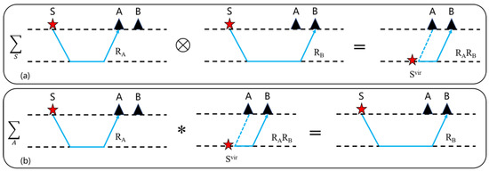 To implement SVI, two essential steps must be followed: First, by correlating the refracted wave received by geophone A with the refracted wave received by geophone B, the common propagation path can be eliminated, allowing for the reconstruction of a virtual refraction RaRb with Ra serving as the virtual source and Rb as the virtual detector (Figure 2a). If m sources exist in the stationary phase region, the refraction data SNR can be enhanced by m . Second, the supervirtual refraction with the actual source S as the source and geophone B as the receiver point can be reconstructed by convolving the refraction wavefield Ra with the virtual refraction wavefield RaRb (Figure 2b). Moreover, if n geophones are present in the stationary phase region, the data SNR can be further improved by n .