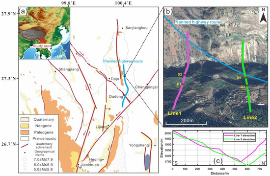 Figure 3. (a) Geological map of study area; (b) satellite map showing the seismic lines and borehole points (D1 at 260 m and D2 at 358 m on Line 1; D3 at 240 m and D4 at 372 m on Line 2); (c) elevation curves of the seismic lines.