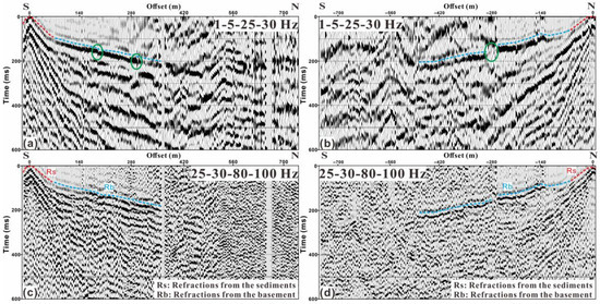 Figure 4. Common-shot gathers of line 1 (a,c) and line 2 (b,d) filtered in different frequency bands via UAV source. Red dashed line: refractions from the sediments (Rs); Blue dashed line: refractions from the basement (Rb); Green circle: discontinuous event.