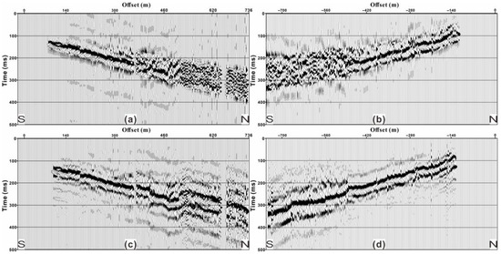 Following trace editing, the first arrivals at the far offset of the original data were restored using the method illustrated in Figure 2. First, to prevent SVI contamination from extraneous waves and artifact generation that might compromise reconstruction fidelity, a temporal windowing process was executed on the raw data. This procedure exclusively extracted the first-arrival signals that embodied the refracted waves (Figure 5a,b). The more concise the window encompassing the refracted wave, the more accurate the outcome. The windowed data were then subjected to crosscorrelation and stacking to obtain the virtual refraction wavefields for different shots. Recognizing that crosscorrelation can broaden the source wavelet and finite-recording aperture, which might lead to a decrease in spatial resolution, a wavelet deconvolution filter was employed to mitigate the impact after acquiring the virtual refraction [29]. In addition, during the first SVI step, crosscorrelation can be substituted by crosscoherence. This alternative proved to be more stable in noisy datasets and remained less susceptible to source-signal perturbations [8]. Subsequently, supervirtual refractions with high SNR were reconstructed through convolution and stacking in the receiver domain (Figure 5c,d). It is evident that a substantial portion of the far-offset traces in the raw shot gathers were disturbed by pronounced noise, obstructing accurate first-arrival picking. Nonetheless, after the SVI processing, the contaminated first-arrival signals were successfully recovered. This process not only amplified the energy significantly but also attenuated the noise, conferring remarkable continuity with the original first arrivals.