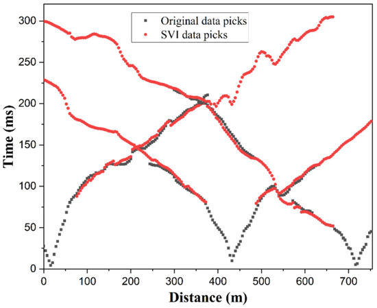Figure 6. Comparison of picked traveltimes before and after SVI enhancement. The curves represent manually picked first arrivals from raw data (black) and SVI-processed data (red) for three selected common-shot gathers. The high consistency between the two indicates that SVI preserves traveltime accuracy while enhancing the ability to reliably identify first arrivals, particularly at far offsets.